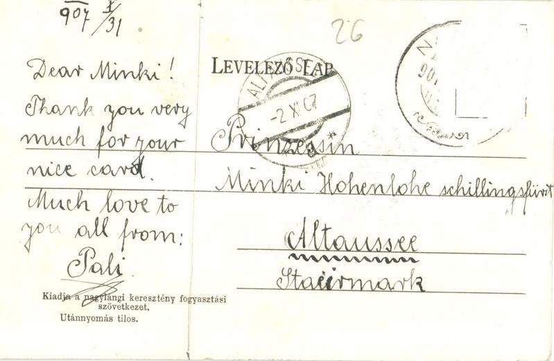 Leírás: 1907 Nagyláng (Soponya), Zichy kastély parkja + Prinzessin Maria Anna (Minki) Hohenlohe-Schillingsfürstnek címezve (Rb)