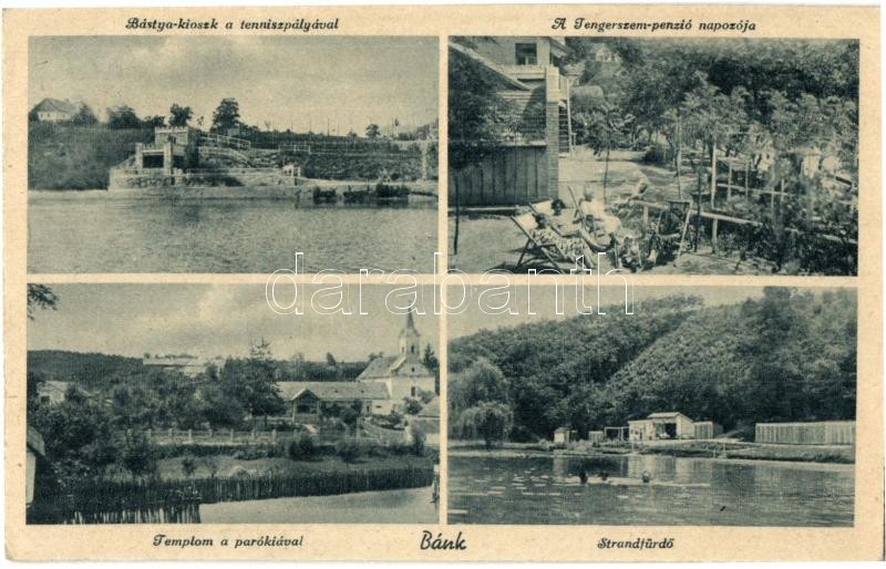 Leírás: Bánk, Bástya kioszk, Tenisz pálya, templom és parókia, strandfürdő, Tengerszem panzió napozója