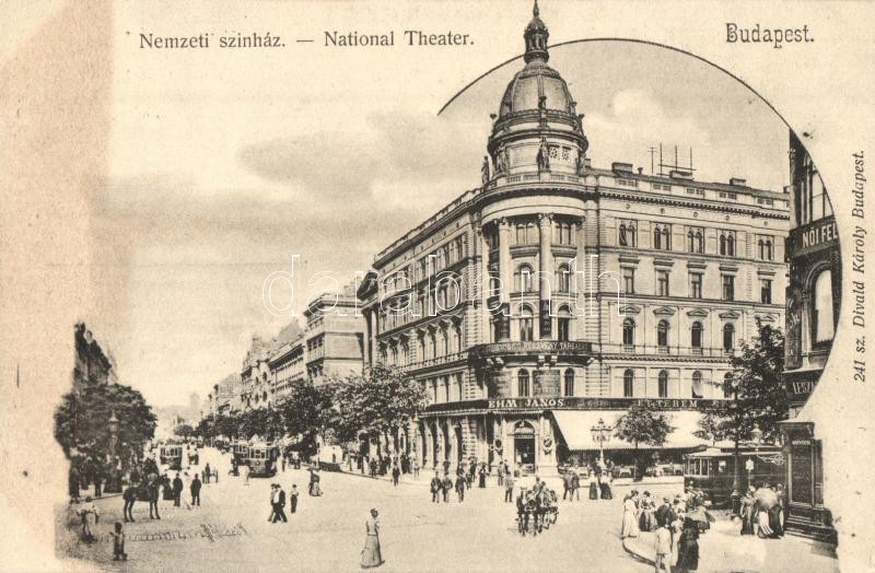 Budapest VIII. Nemzeti színház és bérháza, Ehm János étterme és sörcsarnoka, villamosok, Kerepesi út (Rákóczi út) és Múzeum körút kezdete. Divald Károly 241.