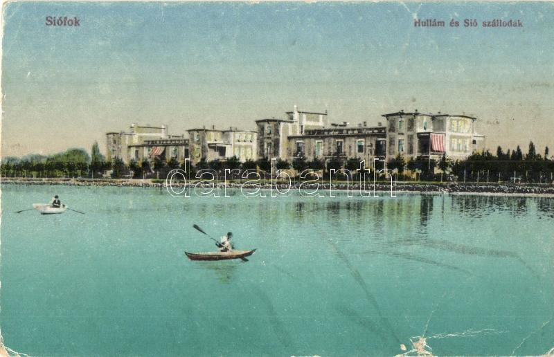 Leírás: Siófok, Hullám és Sió szálloda, csónakázók (szakadás / tear)