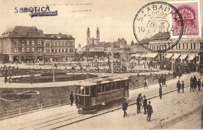 Leírás: Szabadka, Subotica; Szent István tér, villamos, üzletek. Kiadja Heumann Mór / square, tram, shops + 1941 Szabadka visszatért So. Stpl.