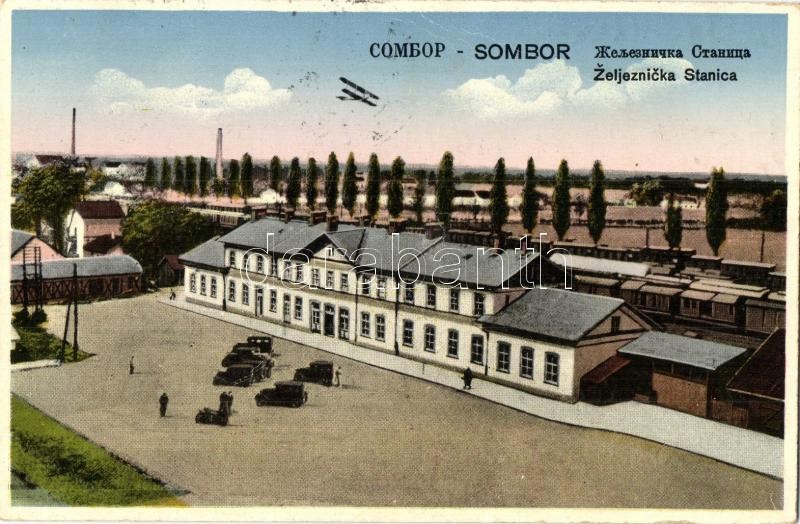 Zombor, Sombor; Zeljeznicka Stanica / Bahnhof / vasútállomás, automobi... https://www.darabanth.com/hu/340-Gyorsarveres/340.0/Kepeslapok/Vajdasag~1000010/Zombor-Sombor-Zeljeznicka-Stanica-Bahnhof-vasutallomas-automobilok-vonat-repulogep-K~II1913441