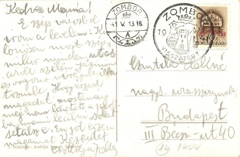 Leírás: Zombor, Sombor; Zeljeznicka Stanica / Bahnhof / vasútállomás, automobilok, vonat, repülőgép. Kiadja Andrija Rangl / railway station, automobiles, train, airplane + 1941 Zombor visszatért So. Stpl.
