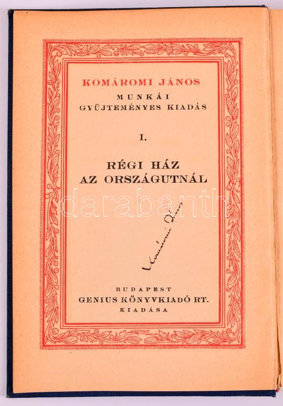 Komáromi János: Régi ház az országútnál. Komáromi János Munkái Gyüjteményes Kiadás. I. Bp.,é.n.,Genius, 344 p. Kiadói aranyozott egészvászon-kötés, kis kopásnyomokkal, tulajdonosi névbélyegzővel. A szerző által aláírt.