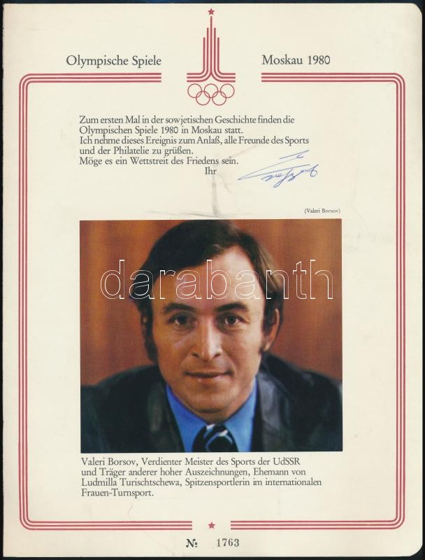 Leírás: 1980 Valerij Borzov ukrán atléta aláírása a moszkvai olimpia emléklapján