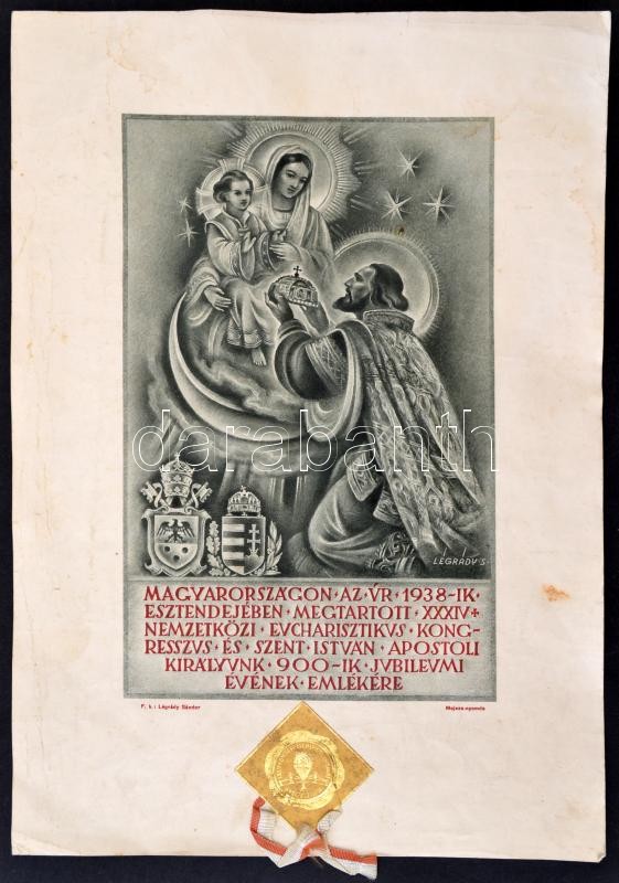 1938 XXXIV. Eucharisztikus Kongresszus és Szent István Király 900 jubileumi évének emléklap. Légrády Sándor grafikájával. Bp., Mojsza-nyomda, gyűrődésekkel.