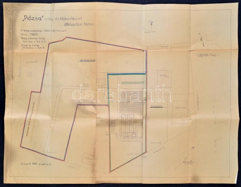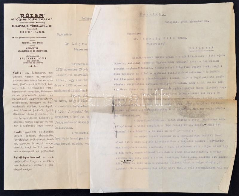 1936-1937 Rózsa virág- és tájkertészet áttelepítési tervének rajza, 47x60 cm, (II. ker. Vérhalom utca), valamint gépelt levele Dr. Légrády Ottó főszerkesztőnek a cég fejléces papírján, valamint annak másolata.