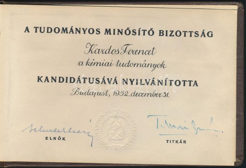 Leírás: 1952 a Tudományos Minősítő Bizottság kandidátusi oklevele Kardos Rezső Ferenc (1912-1998) kémikus, feltaláló részére