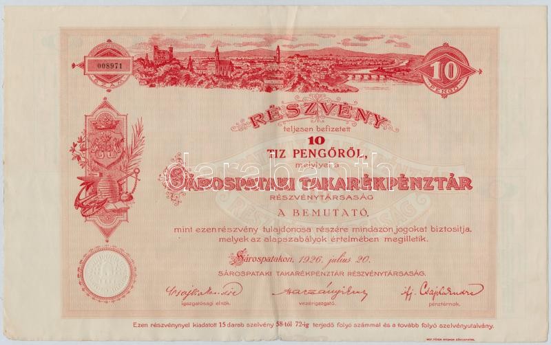 Sárospatak 1926. "Sárospataki Takarékpénztár Részvénytársaság" részvén... https://www.darabanth.com/hu/340-Gyorsarveres/340.0/Numizmatika/Reszvenyek-es-sorsjegyek~2000005/Sarospatak-1926-Sarospataki-Takarekpenztar-Reszvenytarsasag-reszvenye-10P-rol-szara~II1909621