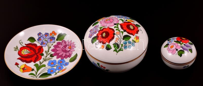 Leírás: Kalocsai porcelán tál és 2 db bonbonier, kézzel festett, jelzett, hibátlan, d: 7, 12, 15 cm