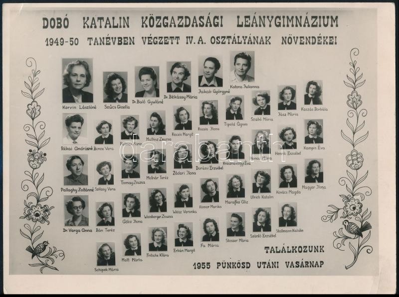 1950 Dobó Katalin Közgazdasági Leánygimnázium tanárai és végzett hallg... https://www.darabanth.com/hu/341-Gyorsarveres/341.0/Fotomuveszet/Foto~500020/1950-Dobo-Katalin-Kozgazdasagi-Leanygimnazium-tanarai-es-vegzett-hallgatoi-kistablo-neves~II1918007