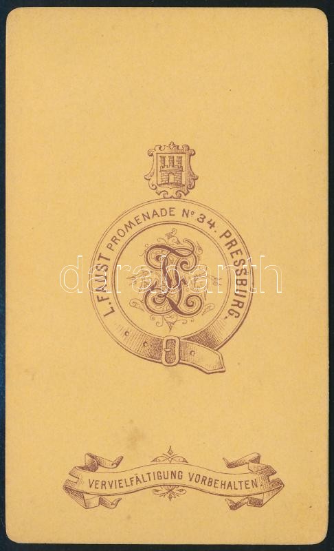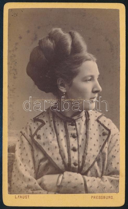 Leírás: cca 1900 Hölgy műtermi portréja, keményhátú fotó L. Faust pozsonyi műterméből, felületén kopásnyom, 10,5×6 cm