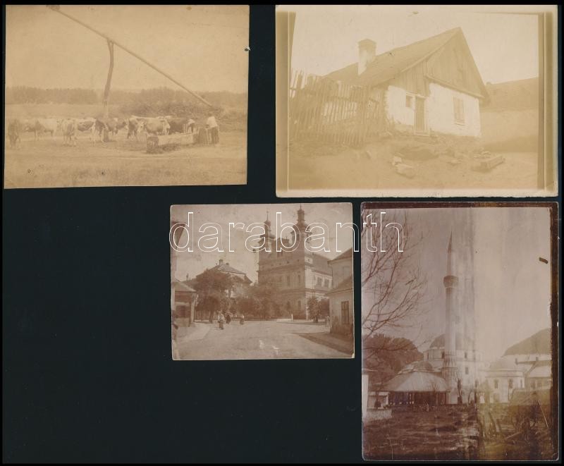 Leírás: cca 1900 Kecskemét + 3 db városképes fotó kb 9x12 cm
