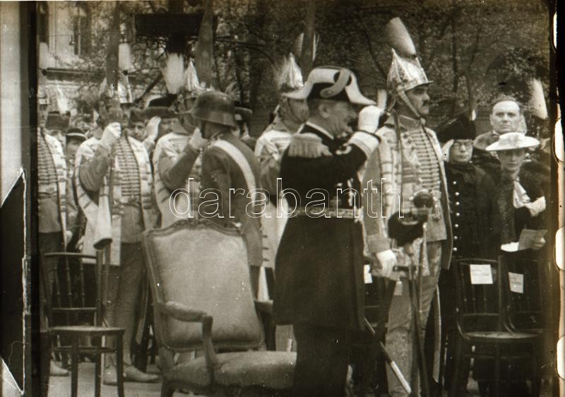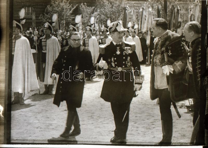 Leírás: cca 1938 Horthy Miklós és Antal István (1896-1975) miniszer koronaőrök kíséretében, 2 db üvegnegatív, 9×6 cm