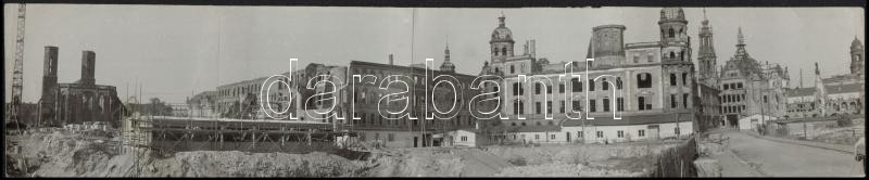 Leírás: cca 1945 Városkép háborús pusztítás után, összeragasztott panorámafotó, felületén törésnyommal, 35,5×7 cm
