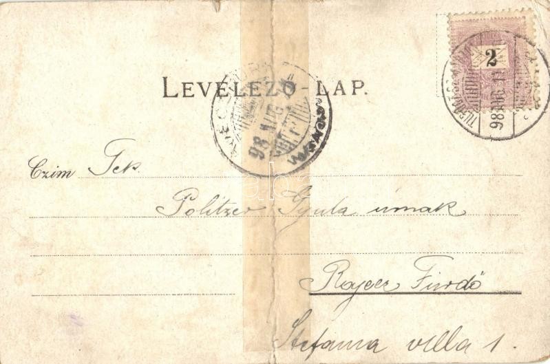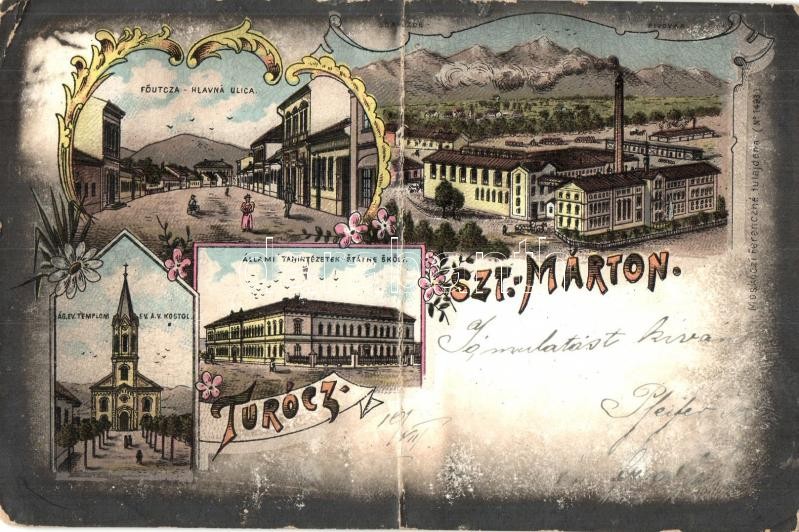 Leírás: 1898 (Vorläufer!) Turócszentmárton, Turciansky Svaty Martin; Fő utca, Ágostai evangélikus templom, Állami tanintézetek, sörfőzde. Moskóczi Ferencné tulajdona / main street, church, school, brewery. Art Nouveau, floral, litho (r)