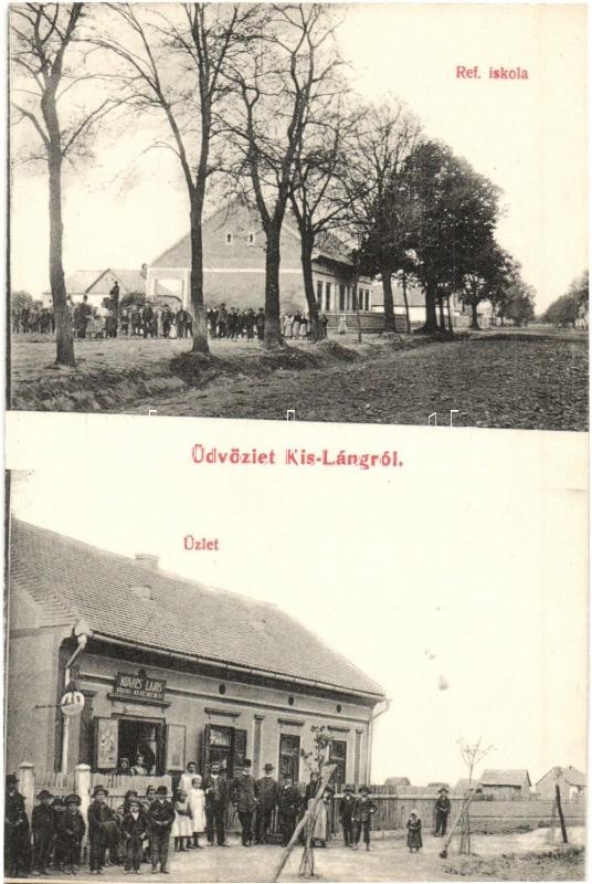 Leírás: Kisláng, Református iskola, Kovács Lajos üzlete, kirakat a tulajdonosokkal