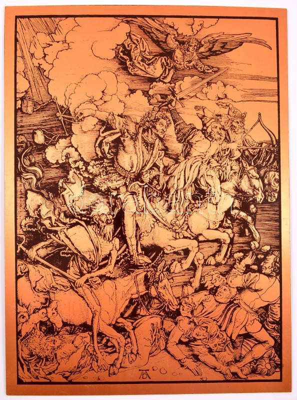 Leírás: Az Apokalipszis négy lovasa, Dürer-metszetről készült modern reprodukció, réz-bakelit lemez, 41×30 cm