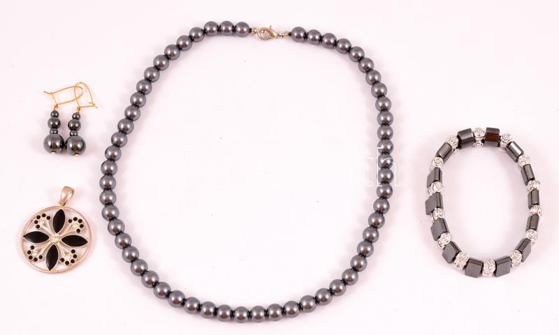 Leírás: Fekete ékszer-összeállítás, karkötő, fülbevaló, medál, gyöngysor, közte hematit ékszerek