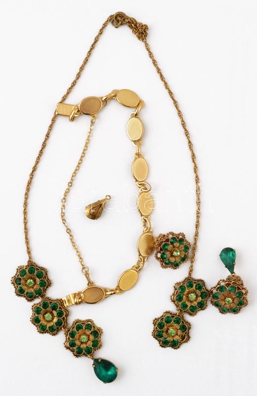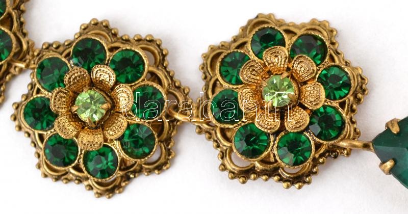 Leírás: Virágos zöld színű köves bizsu szett: nyaklánc, gyűrű, stb., dobozban