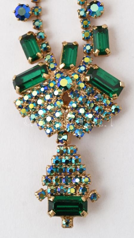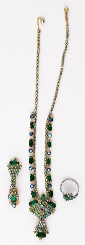 Leírás: Zöld színű köves bizsu szett: nyaklánc, gyűrű, stb., a gyűrű sérült, dobozban