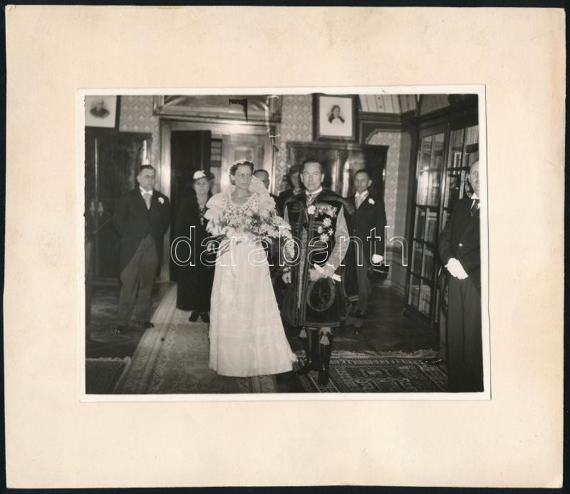 Leírás: cca 1930-1940 Vitézi jelvénnyel és számos kitüntetéssel dekorált díszmagyaros katonatiszt esküvője, fotó kartonon, 11x14 cm