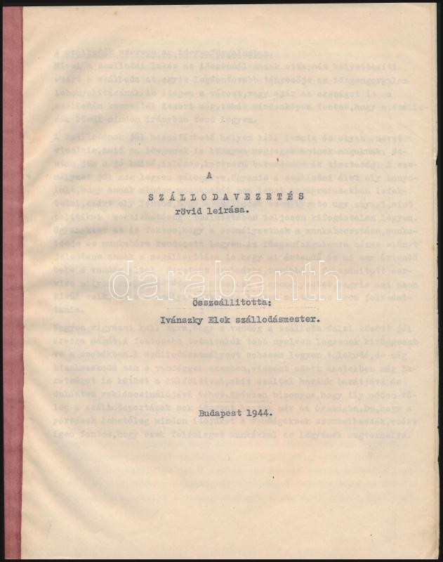 Leírás: 1944 Bp., A szállodavezetés rövid leírása, összeállította: Ivánszky Elek szállodamester, szép állapotban, gépelt, 6p