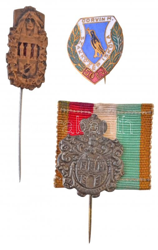 Leírás: 3db-os vegyes magyar és külföldi jelvény és kitűző tétel, közte "Corvin M. Szakközépiskola 50 év" zománcozott jelvény T:2