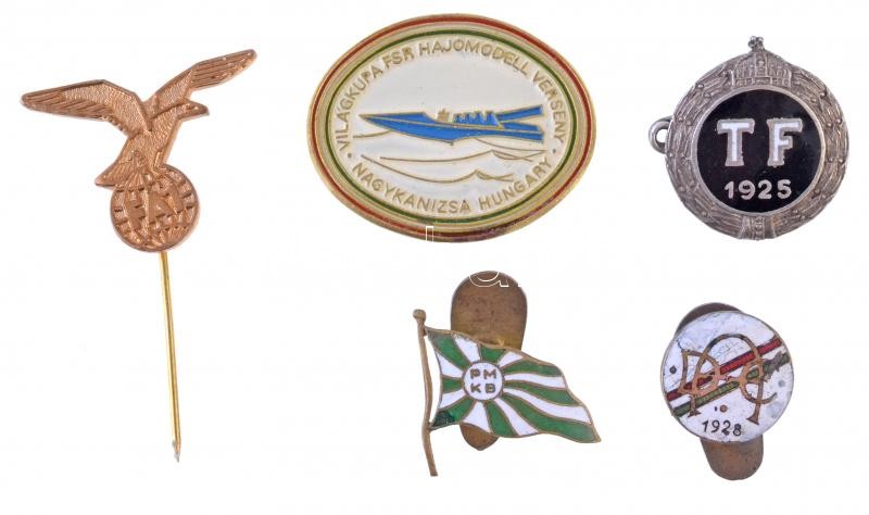 Leírás: 5db klf sport témájú jelvény, közte "TF 1925", "Világkupa FSR Hajómodell Verseny - Nagykanizsa" T:2