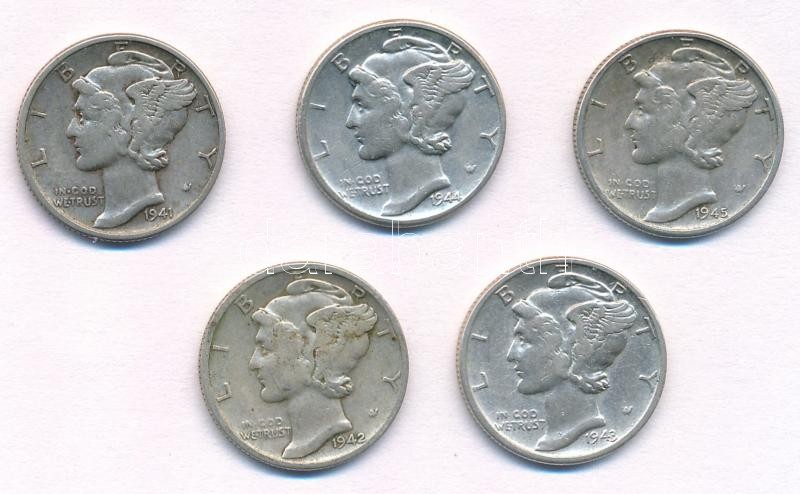 USA 1941-1945. Dime Ag "Mercury" (5xdiff) C:XF,VF