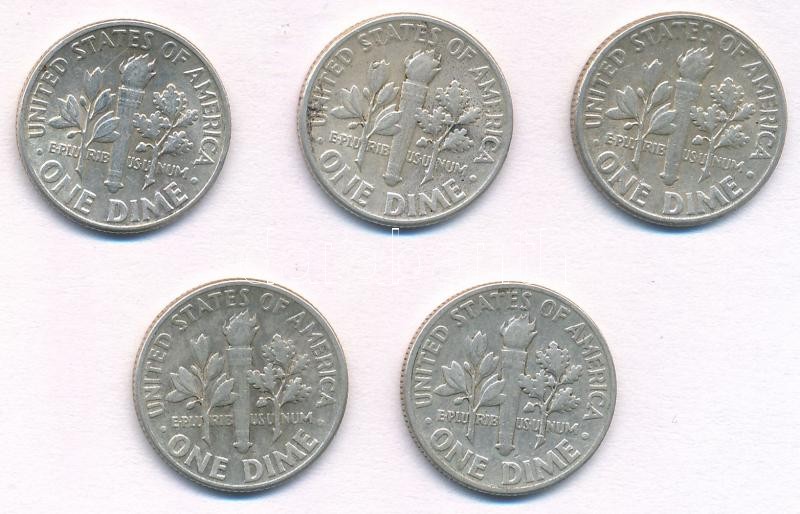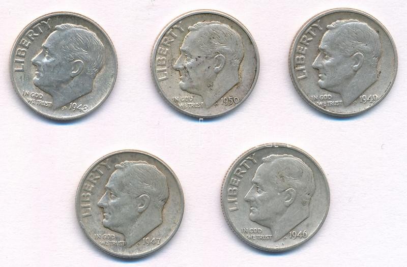 USA 1946-1950. Dime Ag "Roosevelt" (5xdiff) C:XF,VF