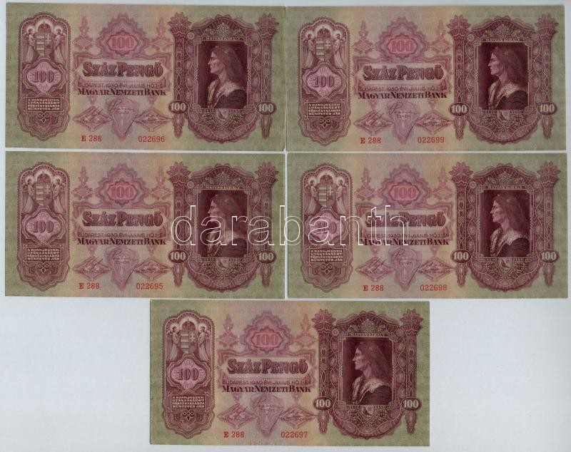 1930. 100P (5x) sorszámkövetők T:I- https://www.darabanth.com/hu/341-Gyorsarveres/341.0/Numizmatika/Magyar-bankjegyek~2000007/1930-100P-5x-sorszamkovetok-TI-~II1919980