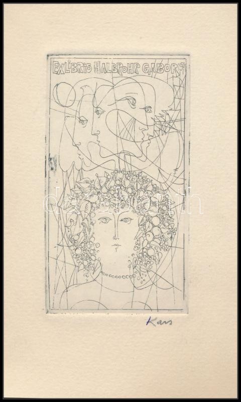 Leírás: Kass János (1927-2010): Ex Libris Halbrohr Gábor. Rézkarc, papír, jelzett, 12x7 cm