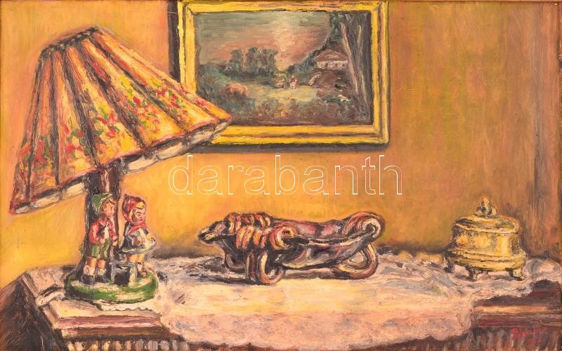 Leírás: Blelcher jelzéssel: Hummeles csendélet. Olaj, vászon, fa keretben, 34×53 cm