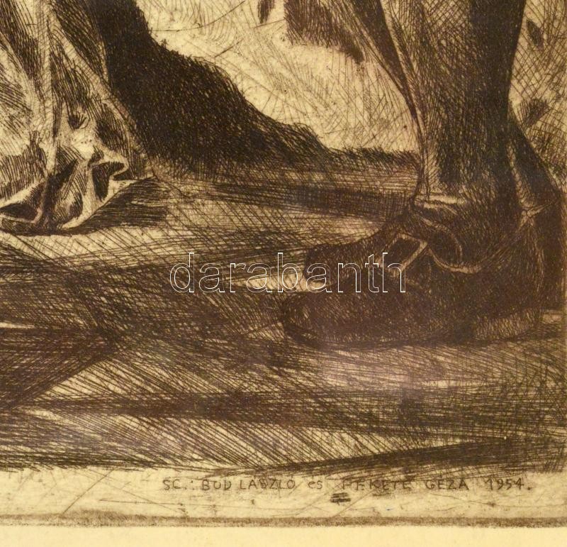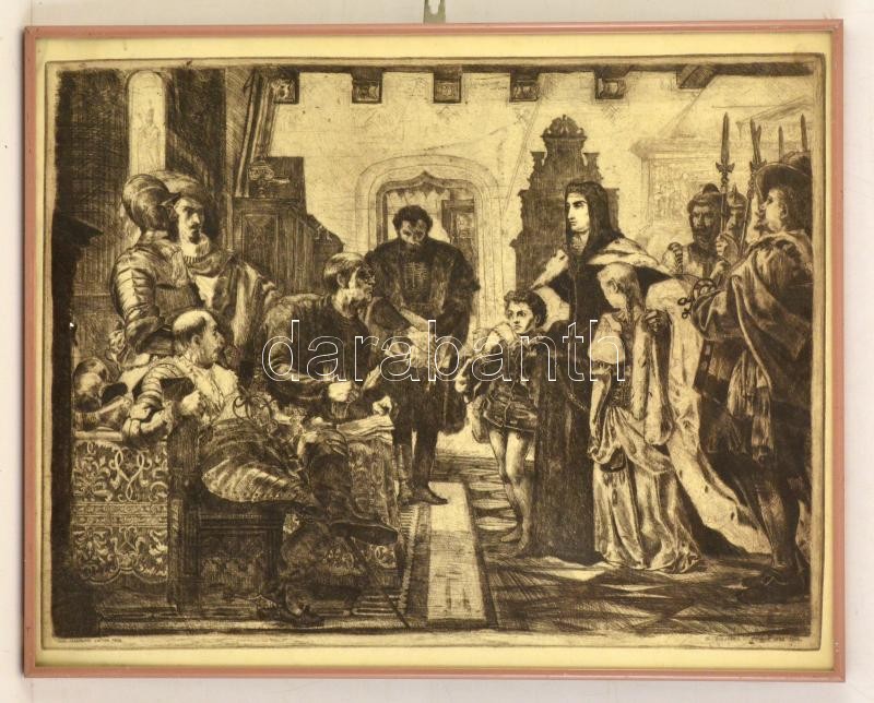 Bod László (1920-2001)-Fekete Géza (?-?): Zrínyi Ilona vizsgálóbírái előtt (Madarász Viktor festménye). Rézkarc, papír, jelzett a karcon, üvegezett keretben, 36×48 cm