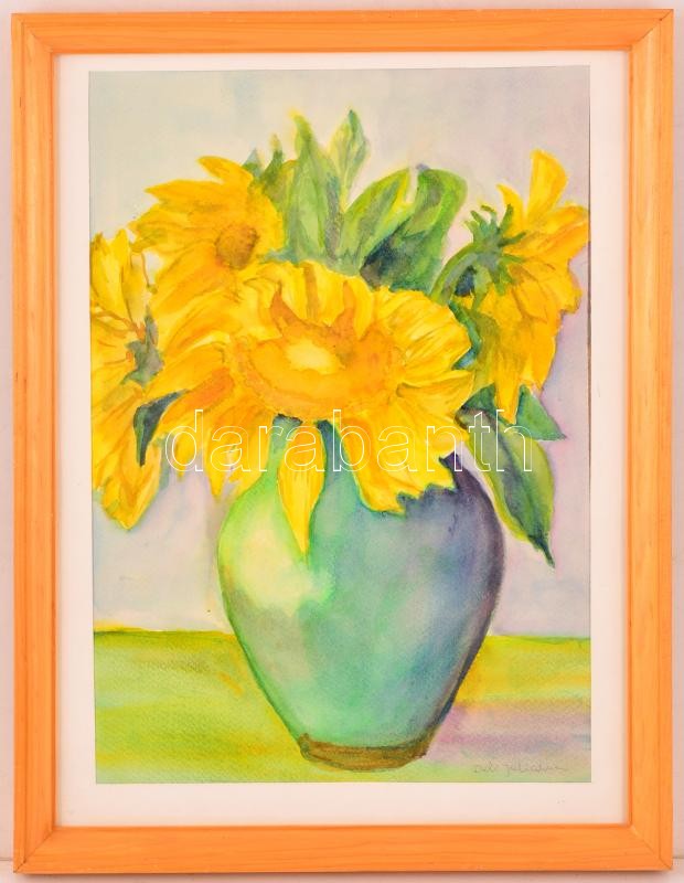 Leírás: Deli Julianna (1962-): Napraforgós csendélet. Akvarell, papír, jelzett, üvegezett keretben, 37×25 cm