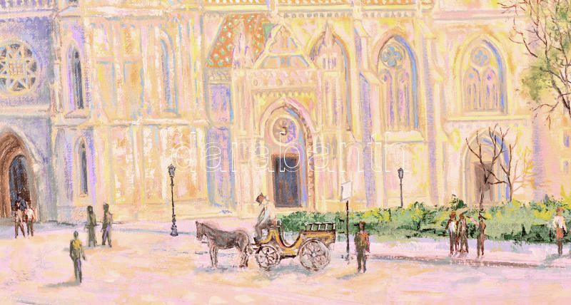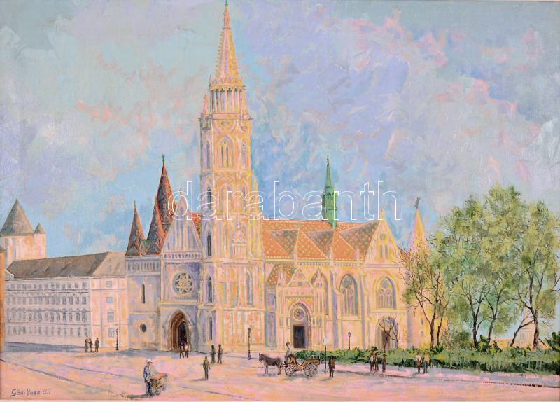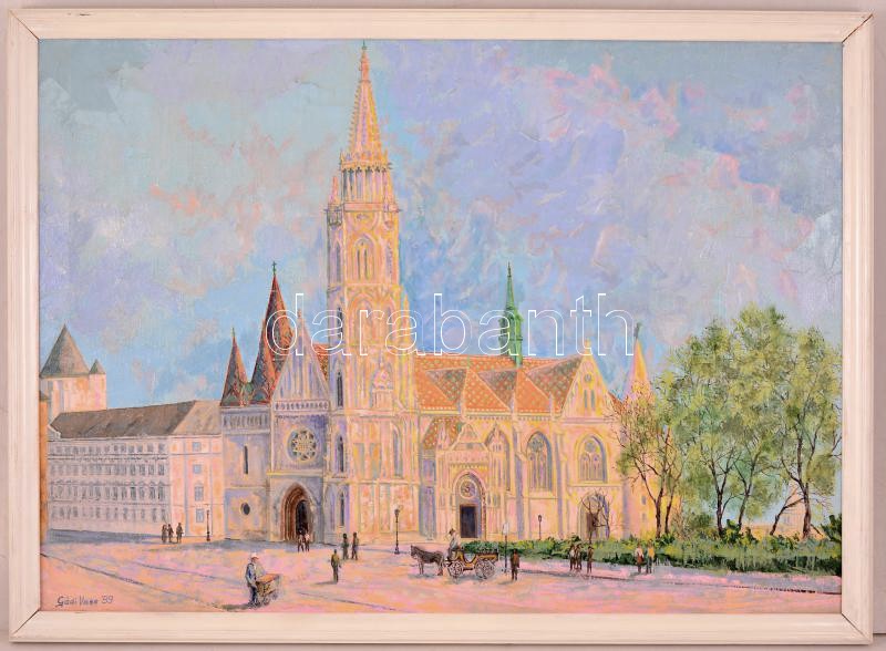Leírás: Gödi Vass István (1941- ): Mátyás-templom, olaj, vászon, jelzett, fa keretben, 48,5×68 cm