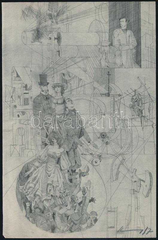Leírás: Kass János (1927-2010): Az ember tragédiája, 11. szín: London. Rézkarc, papír, jelzett, körbevágott, 24×15 cm