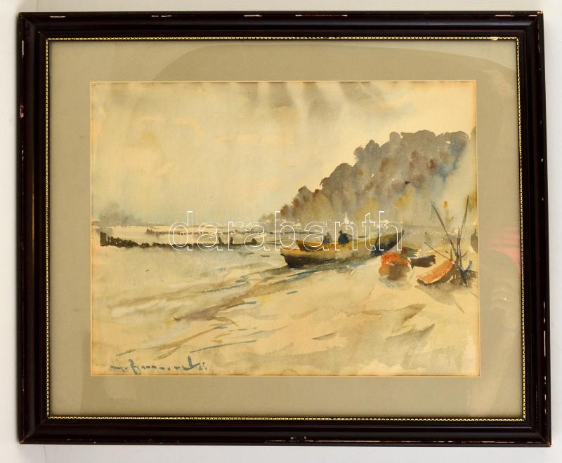 Leírás: Olvashatatlan jelzéssel: Csónakok a parton. Akvarell, papír, üvegezett keretben, 43×55 cm