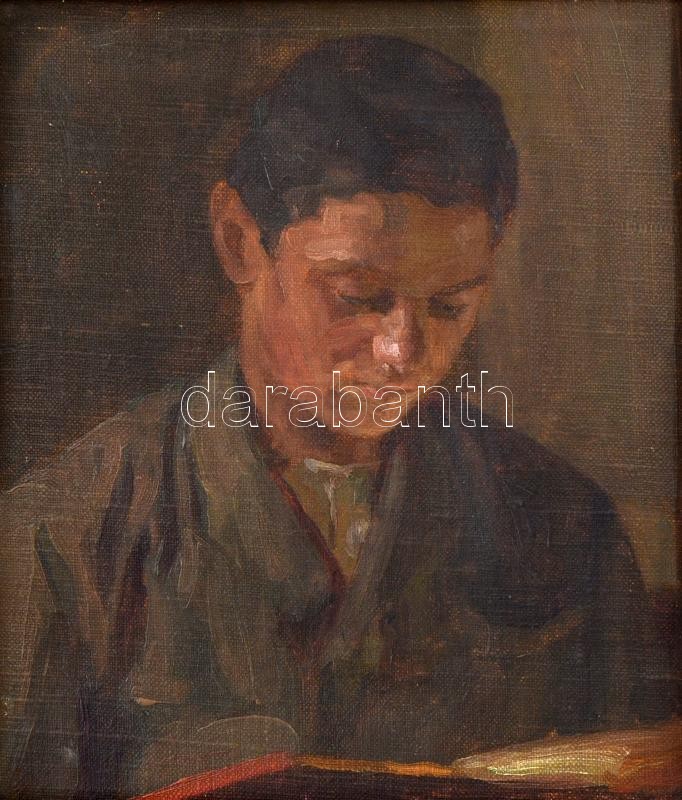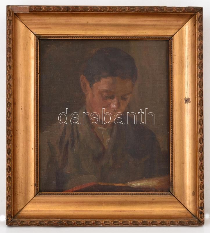 Leírás: Olvashatatlan jelzéssel: Olvasó fiú. Olaj, vászon-fatábla, keretben, 30×26 cm