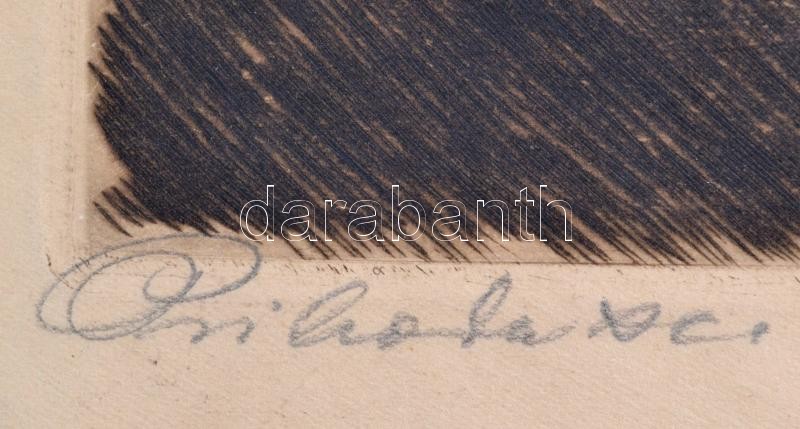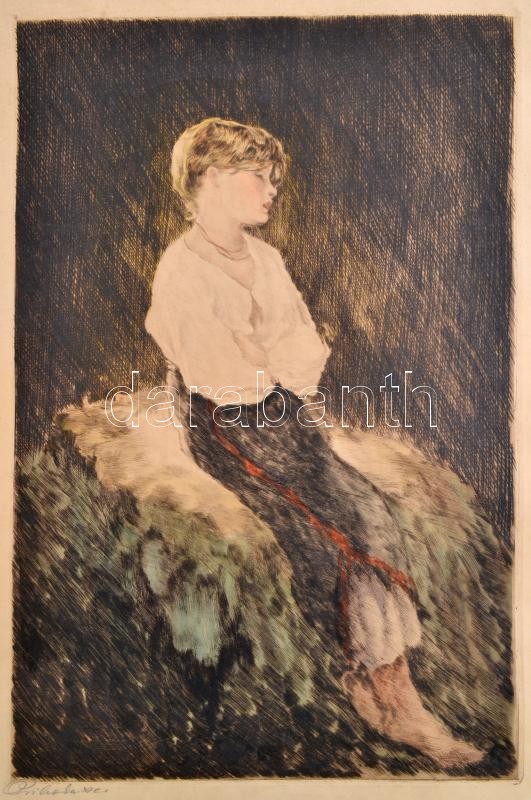 Leírás: Prihoda István (1891-1956): Üldögélő lány. Színezett rézkarc, papír, jelzett, foltos, 47×31 cm