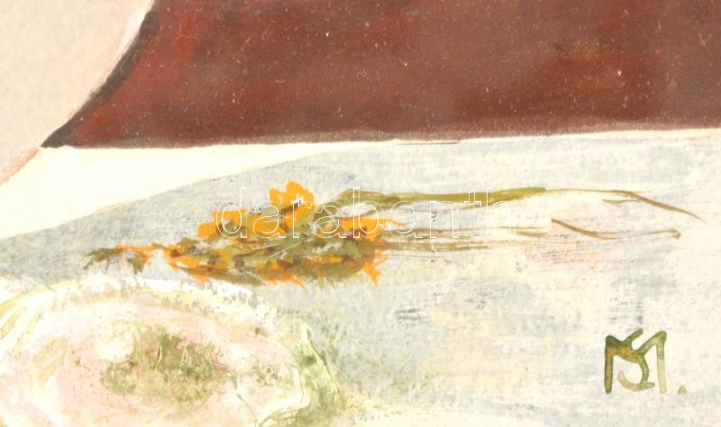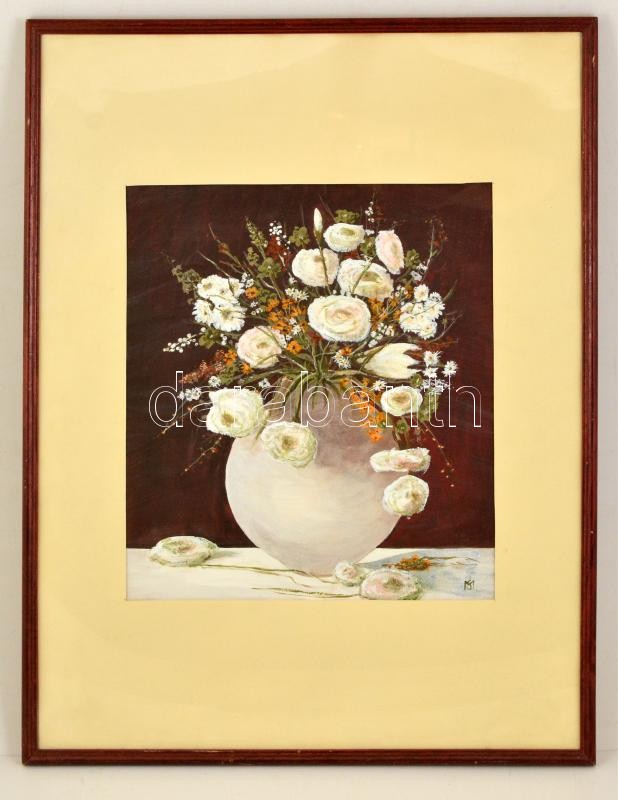Leírás: SM jelzéssel: Virágcsendélet. Tempera, papír, üvegezett keretben, 37×33 cm