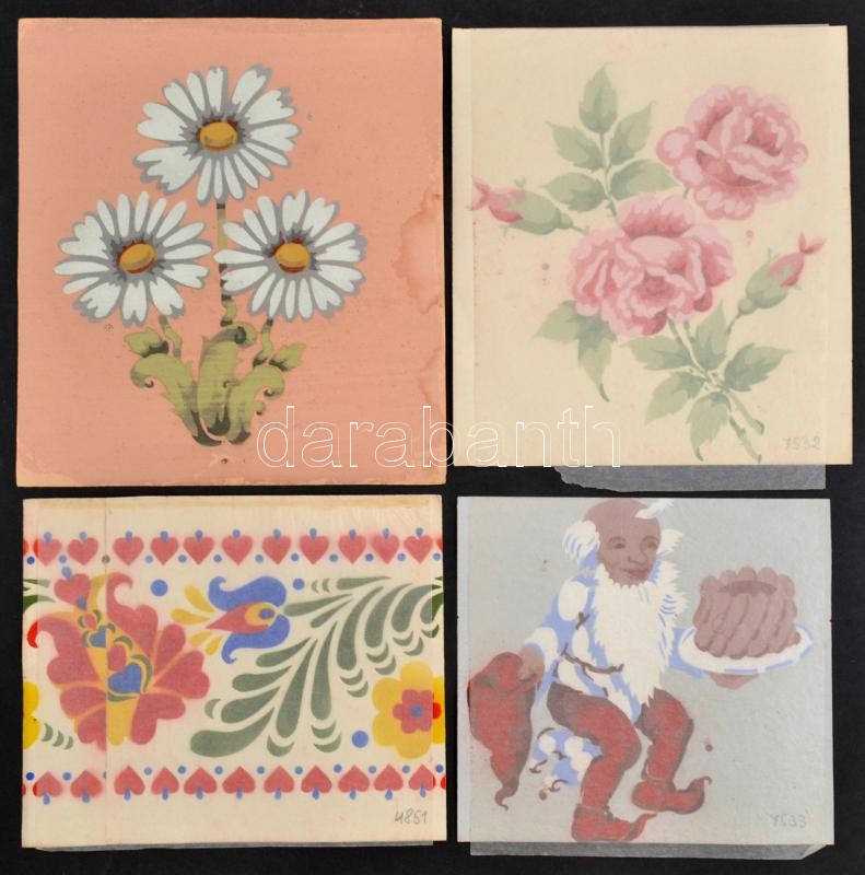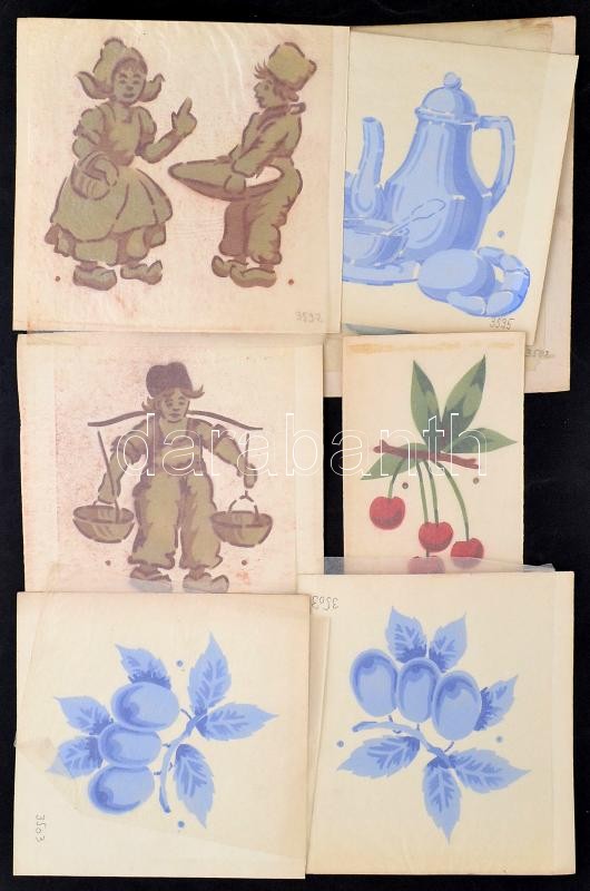 Leírás: Schönfeld Vilmosné (?-?): Festősablon minták, 11 db. Akvarell, papír, jelzett, különböző méretekben