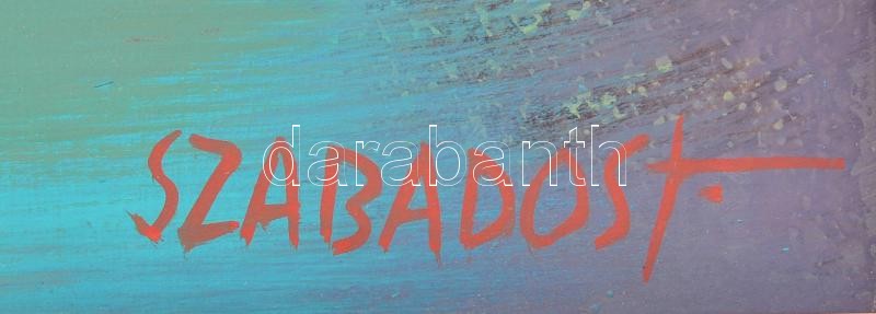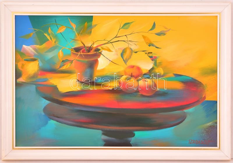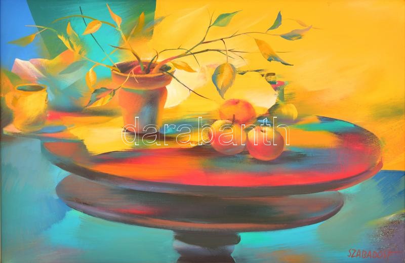 Leírás: Szabados János (1937-): Vörös asztal. Olaj, farost, jelzett, keretben, 40×60 cm