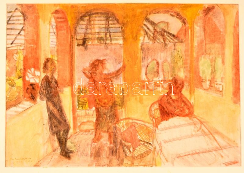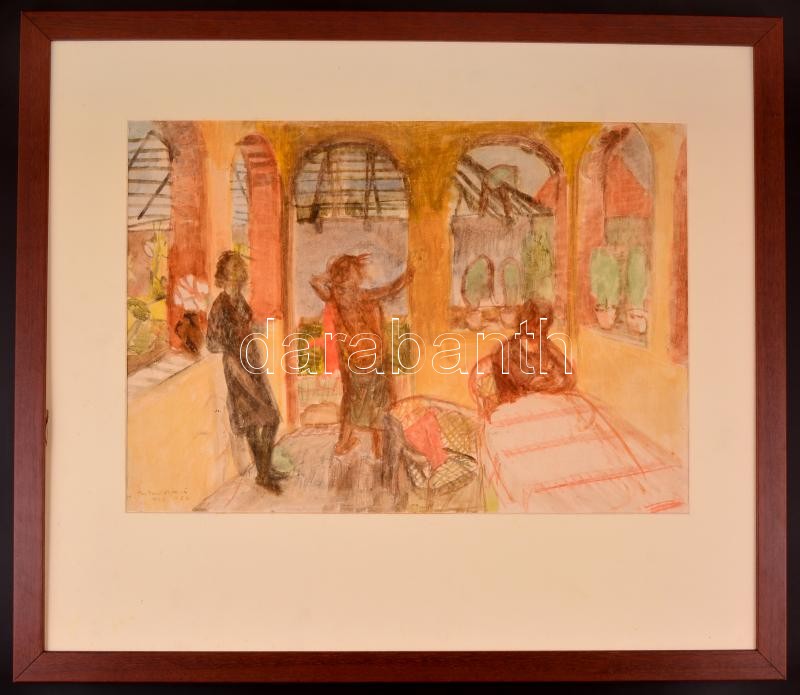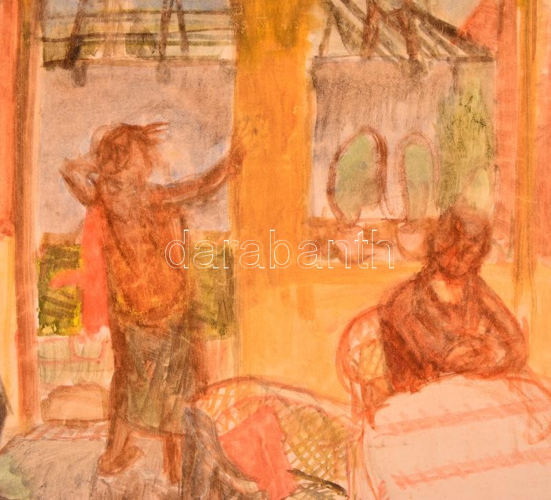 Leírás: Szabados Jenő (1911-1942): Hárman a verandán, Akvarellpapír, jelzett, üvegezett keretben, 32x46 cm (üveg törött)