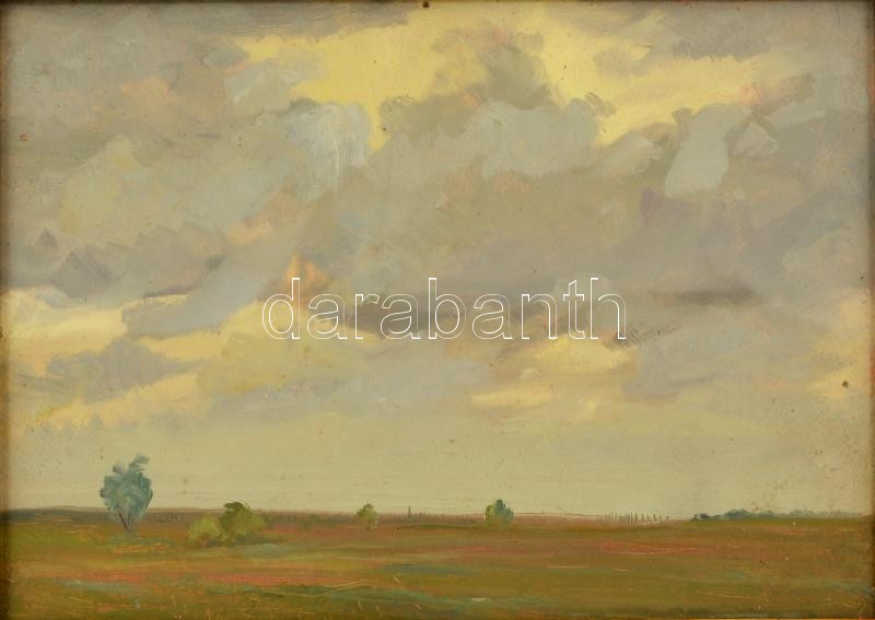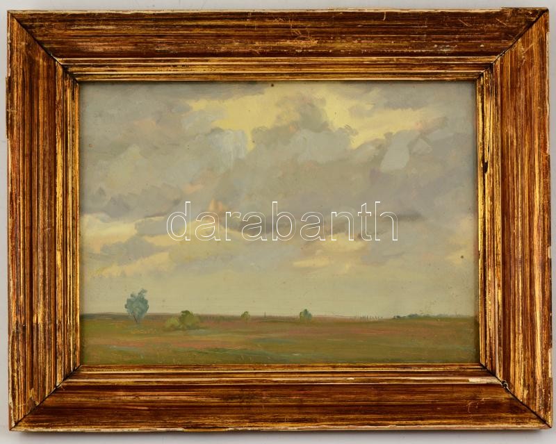 Leírás: Szegedi Molnár Géza (1906-1970): Alföldi táj. Olaj, karton, jelzett, üvegezett keretben, 26×35 cm