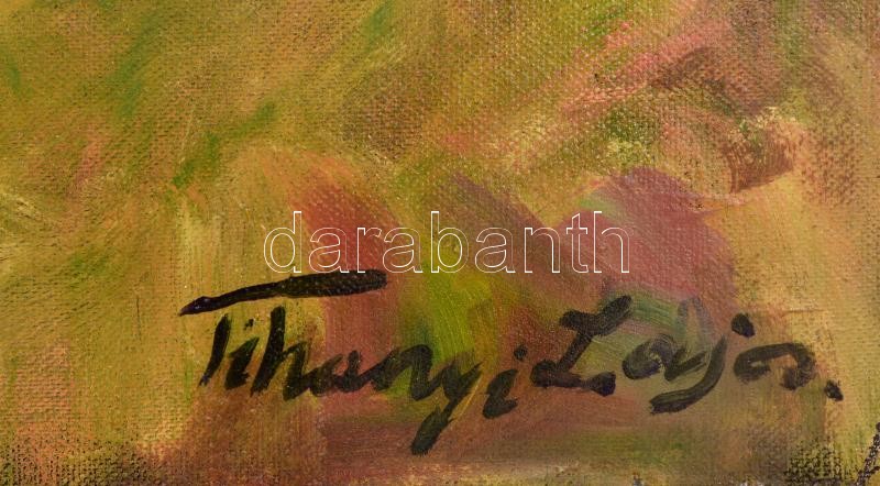 Leírás: Tihanyi jelzéssel: Aktok a vízparton. Olaj, vászon-farost, 67×80 cm