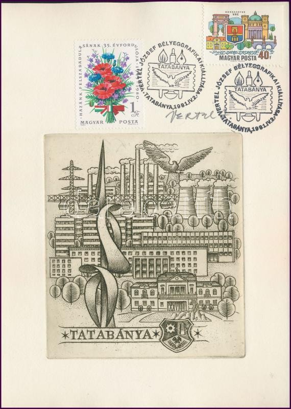 Leírás: Vertel József (1922-1993): Tatabánya. Rézkarc, papír, jelzett, 10x11 cm. Alkalmi bélyegzéssel