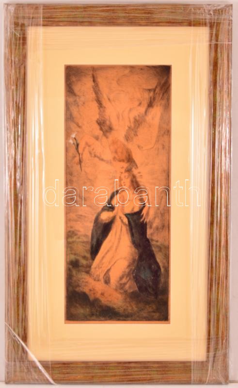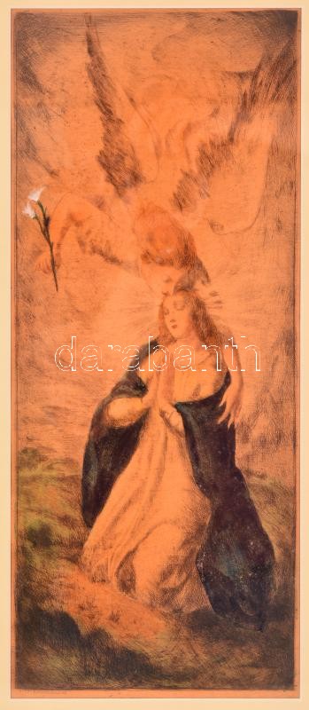 Leírás: Vidai Brenner Nándor (1903-?): Angyali üdvözlet. Akvarell, rézkarc, papír, jelzett a karcon, 48x18 cm Üvegezett keretben