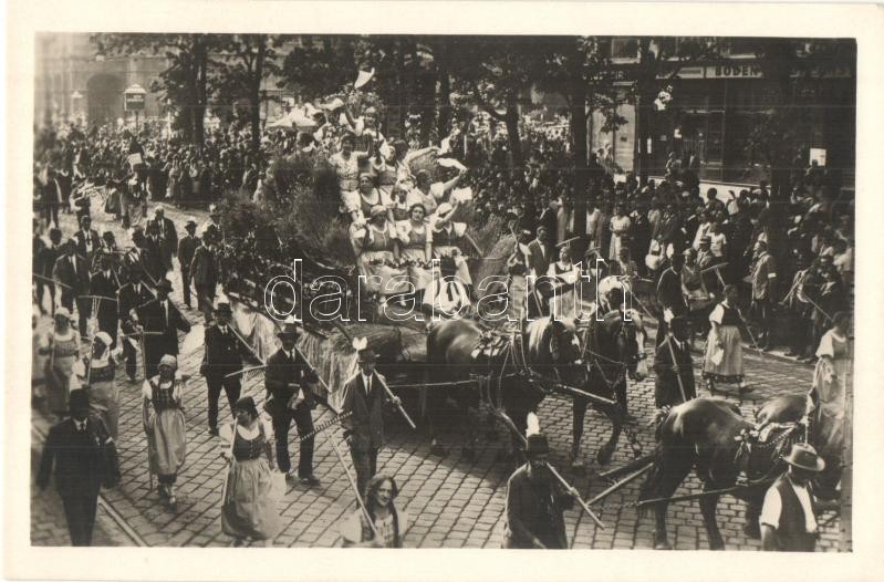 Leírás: 1928 Vienna, Wien; X. Deutsches Sängerbundesfest, Festzug, Festwagen "Erntefest" Burgenland / German Song Festival, festival cart of Burgenland